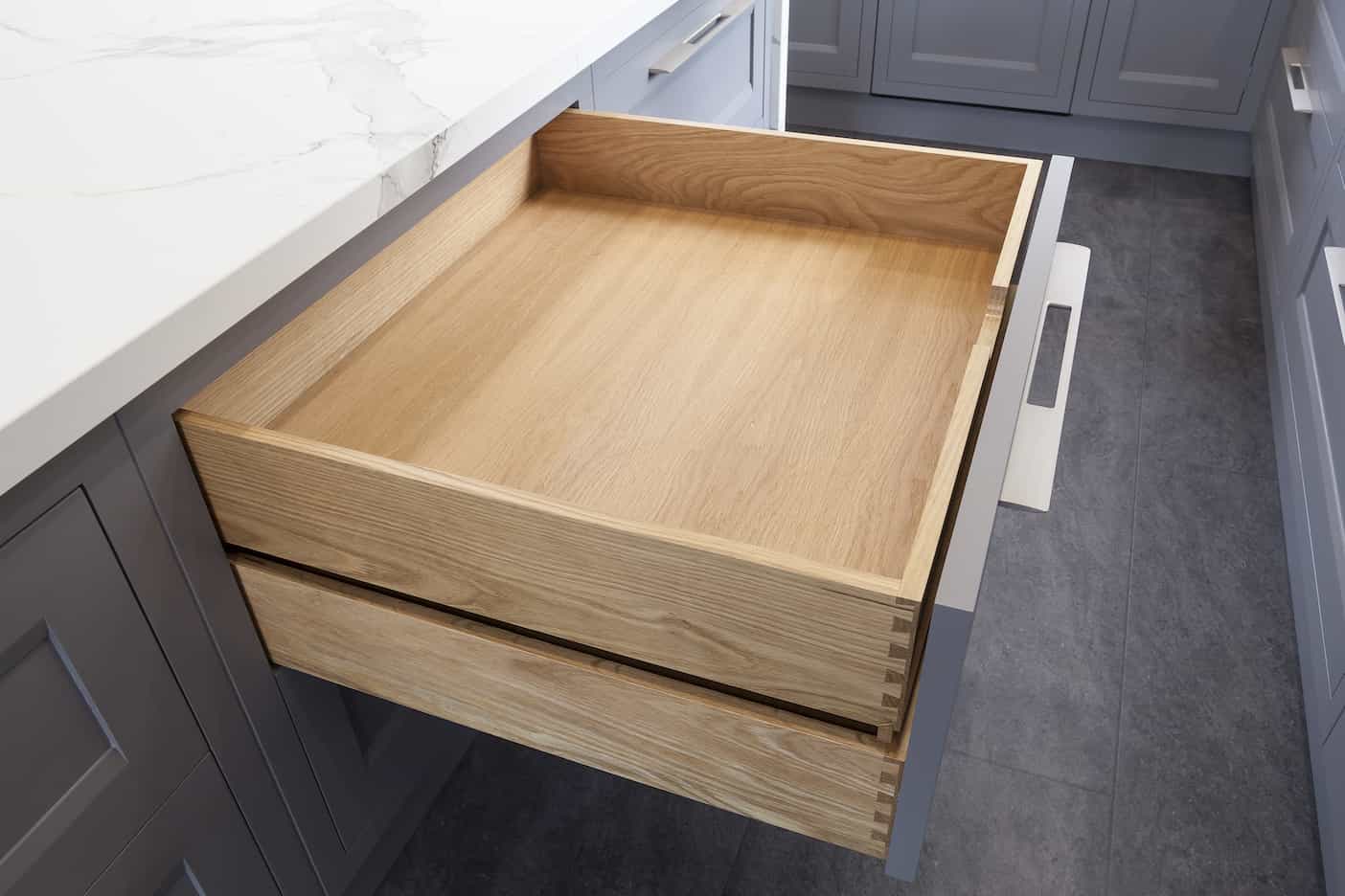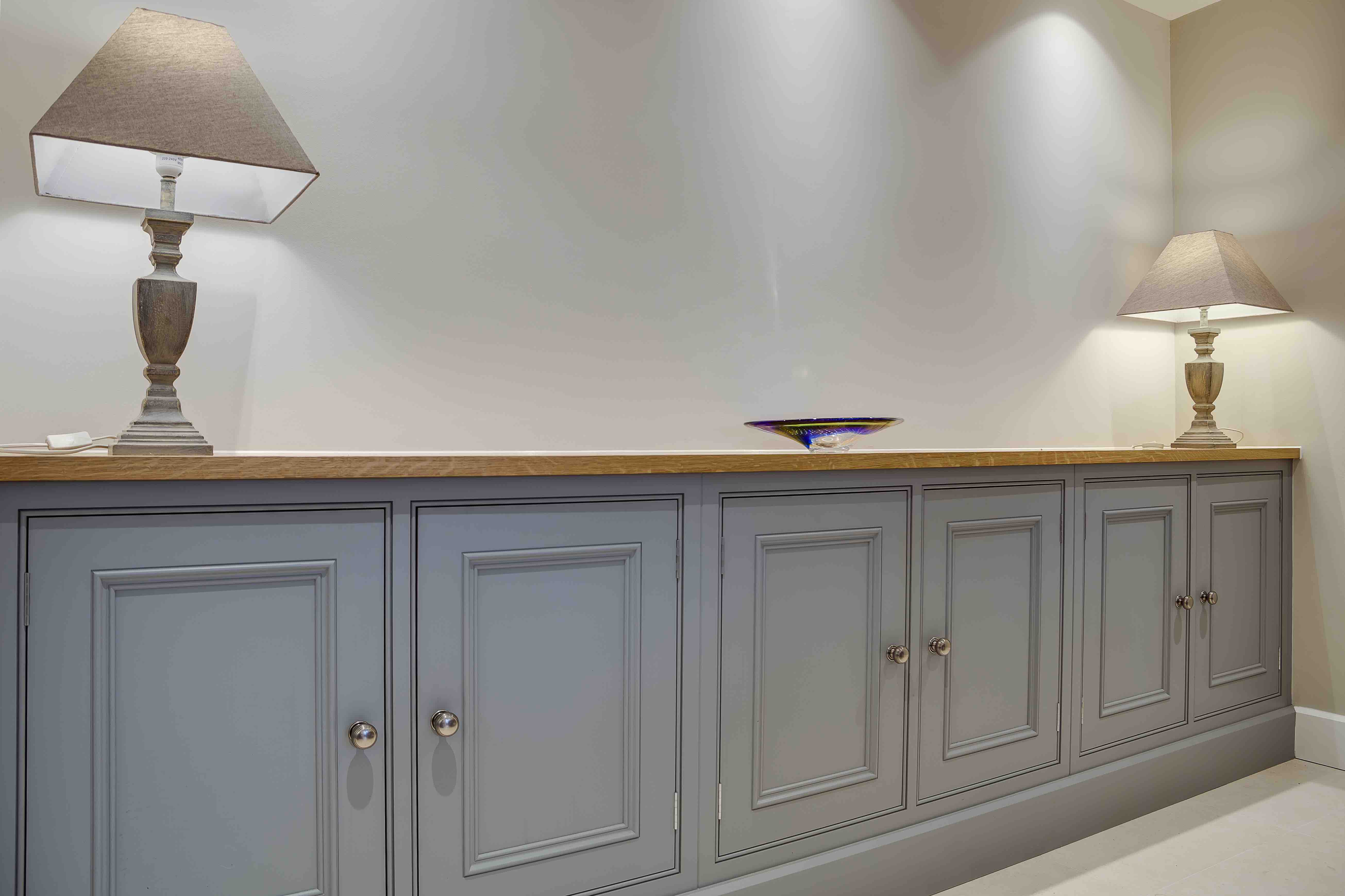 A recent move into a new build property which had. Kitchen that simply didn't work for this client. We gave her a larder, set ovens at the right height, hugely increased drawer storage and work surface space, built an overmantel and made a tidy job of hiding the boiler. Lacquered oak rather than a painted finish was her preference and we book matched the grain on the main seven drawer chest