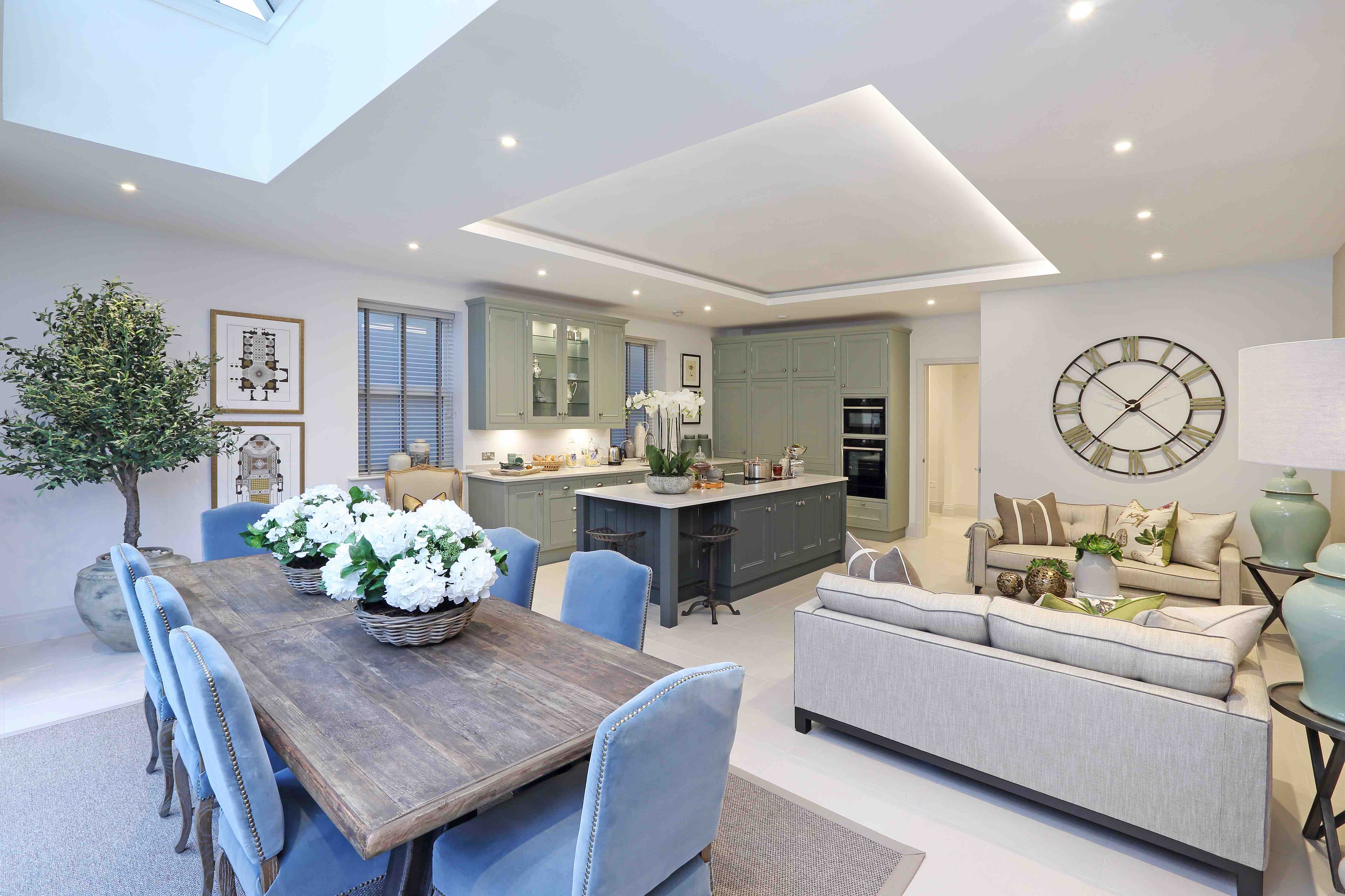 Not our usual type of client, we were approached by Vanderbilt Homes about designing and installing 6 kitchens and utility rooms for a prestigious development in Weybridge. These tall, townhouses were beautifully built and needed a kitchen to really capture the attention of potential buyers. We made the most of the tall ceilings by taking the cabinetry up high which gives it real presence in this large room. A large, really social island, with seating at one end, sitting perfectly in front of the wall units and hand finished in a darker colour than the rest of the kitchen finished it off nicely.